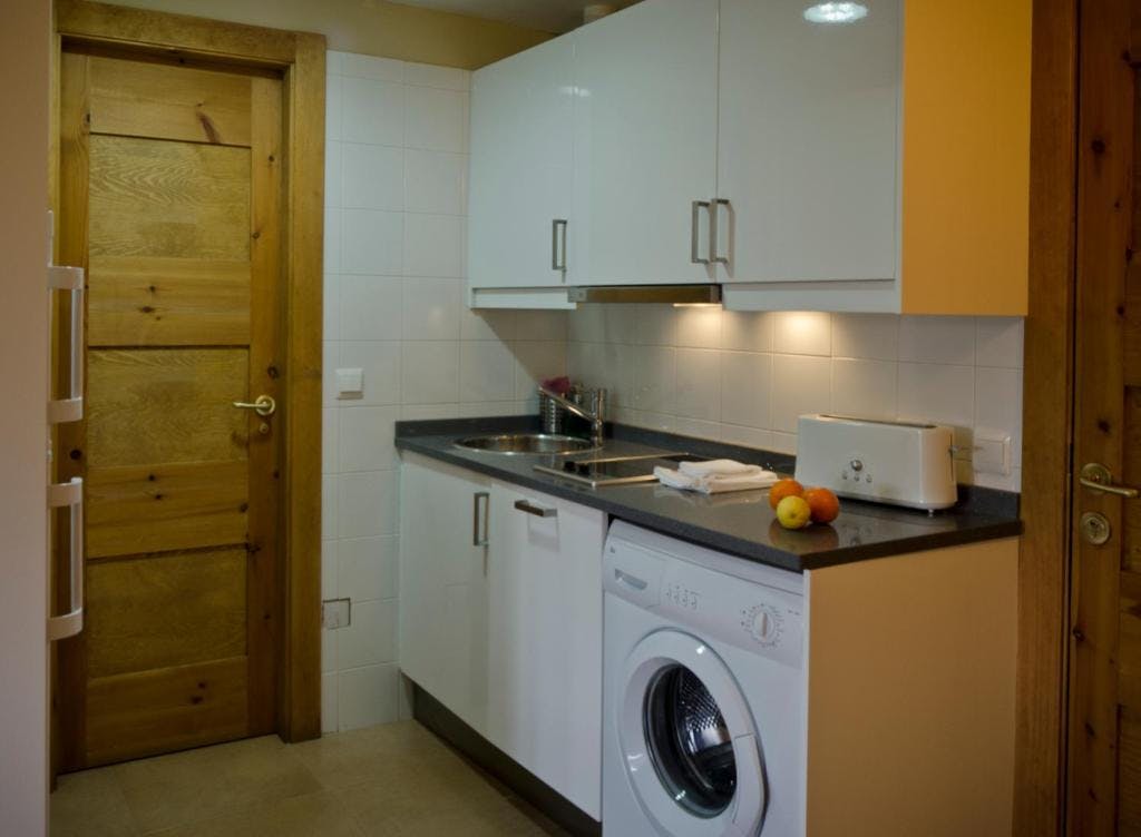 Cocina equipada con lavadora, lavavajillas, horno de convección con función microondas, pequeños electrodomésticos (batidora, exprimidor, cafetera, tostadora, hervidor de agua...).El menaje de cocina es completo y la ropa (sábanas, toallas, manteles, paños...) está incluida.